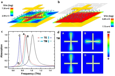 近期,王磊博士与南京大学、大阪大学相关课题组合作,首次设计实现了一种高性能的超材料/石墨烯共同驱动的液晶可调THz器件。以往基于液晶电控可调的超材料THz器件,为了方便加电场控制液晶,超材料除了做功能器件外,同时当电极使用,这就使得超材料单元必须至少一边相连。这样不仅降低了超材料设计的灵活性,而且由于这个连接线,超材料性能有所下降。该工作设计了一种高效复合电极,把少层多孔石墨烯集成到超材料表面,这样不仅超材料可以设计成各种类型,而且电极的面电阻也比单纯石墨烯电极的更小。用这种电极,又进一步设计实现了一种高效液晶可调十字架型THz超材料吸收器,而且精确设计不同的十字架臂长,从而实现高性能的宽带可调。如下图所示,少层多孔石墨烯集成到超材料表面,可以提供非常均匀的静电场来高效控制液晶,也使其工作电压较以往有所降低,而且作为透明电极不影响THz波透过特性。