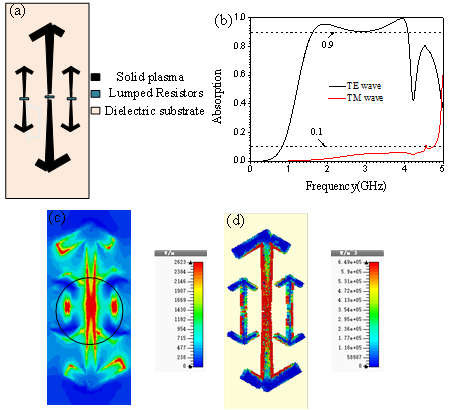 近期,张祖兴教授团队的章海锋老师与本科生杨靖、张浩和刘佳轩设计实现了一种基于等离子体超材料和集总电阻的超宽带吸波器。目前,拓宽吸波器吸收带宽主要方式有加载集总电阻、使用多层结构和多单元结构,相对于后面两者,加载集总电阻的方式相对比较简单,所以该工作通过加载集总电阻的方式来拓宽吸收带宽。一般的吸波器在TE波下实现高吸收率的同时,很难在TM波下实现较好的反射率,而且一般的吸波器其吸收带宽不具有可调谐性。所以该工作设计了一种工作在微波波段的基于等离子体超材料的吸波器,我们在设计吸波器时用等离子体超材料来构成谐振结构,并通过可编程的逻辑阵列来控制等离子体超材料的激励区域和其激励状态,以此来实现对吸波器工作频域的动态调控。在激励区域选择合适的情况下,该工作设计的吸波器其吸收频域可以有效的覆盖整个S波段并且可以拓展至LC波段,而且在TE波的吸收频域内,TM波具有很高的反射率,几乎可以被100%的反射。所以该吸波器可以很好地用于对入射电磁波的极化分离,如下图(b)所示。如图(c)(d)所示,电场主要集中在加载的集总电阻旁,入射电磁波的能量主要是由加载到谐振单元上的集总电阻的欧姆损耗造成的,所以可以通过加载集总电阻的方式实现吸波器的超宽带吸收。