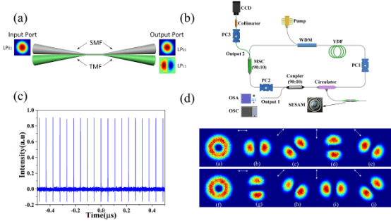 近期,张祖兴教授团队的万洪丹老师和研究生汪杰同学实现了一种基于模式选择耦合器的被动锁模柱矢量光纤激光器。目前,柱矢量激光主要通过空间相位调制器、组合半波片、双折射晶体和亚波长光栅等体块式自由空间器件对光偏振态的精确调控来获得。但是利用上述器件产生柱矢量激光,对于这些器件的精密程度和作用范围都有着严格的要求,而且光路不易集成、制作成本高。近几年,利用全光纤的方法激发高阶模并获得柱矢量激光成为研究热点,主要利用光纤错位耦合的方法激发高阶模,以少模光纤光栅作为横向高阶模选模单元,结合锁模技术可以获得超短脉冲柱矢量激光,然而光纤错位耦合的方法产生的高阶模损耗较大,柱矢量激光斜率效率低、输出功率小,限制了其在长距离光纤通信和光纤传感系统中的应用;并且通过错位耦合的方法产生高阶模的同时,必须使用少模光栅进行选模操作,而少模光栅制备技术要求高,周期长,价格昂贵,实用化性能较低。所以该工作设计了一种新型的全光纤器件,即模式选择耦合器,此器件可以实现模式转换和模式选择两个功能,如下图(a)所示,当单模光纤中的基模和少模光纤中的高阶模实现相位匹配时,单模光纤中的基模将向少模光纤中的高阶模转换,并从少模光纤中输出高阶模。如下图(b)、(c)和(d)所示,当把模式选择耦合器置入光纤激光器,结合腔内的偏振控制器将激光腔获得柱矢量激光。腔内置入可饱和吸收体SESAM,利用SESAM的可饱和吸收特性可实现锁模操作,实现高纯度超短脉冲柱矢量光输出。该锁模柱矢量光纤激光器的重复频率为18.58MHz,角向偏振光束和径向偏振光束的模式纯度>95%。