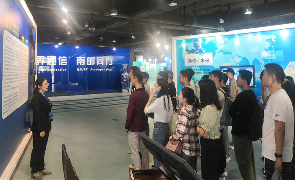 在讲解员的带领下,同学们首先参观了通信展览馆。它以“世界通信南邮同行”为主题,从古至今、深入浅出地介绍了通信技术的发展历程。从古代的烽火、邮驿通信,到现在物联网与5G技术,同学们在馆中领略了母校对国家通信现代化的贡献。同时,讲解员带领同学们在展厅中观看了5G发展视频,让同学们对5G未来有了更多的畅想。