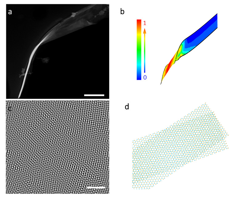 1a 局部扭转形变的螺旋型WS2纳米条带,b 基于有限元分析的螺旋型WS2纳米条带表面应力分布,c WS2纳米条带高分辨电镜图显示的莫尔超晶格,d 莫尔超晶格原子结构示意图