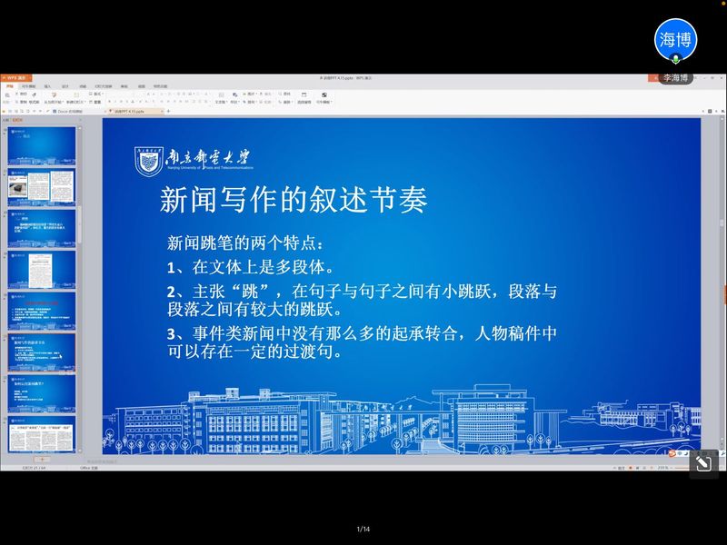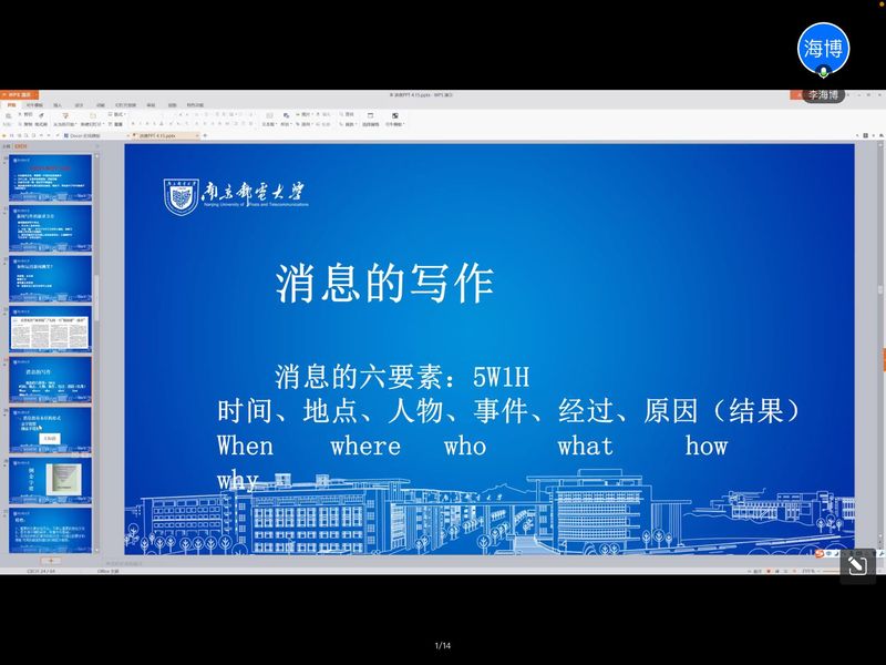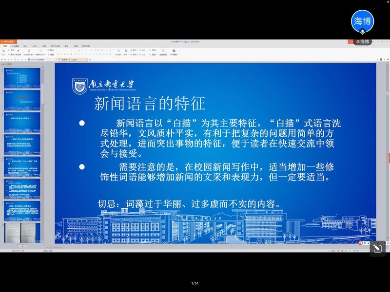 为提高学员撰写文章的能力,坚定走好中国道路,讲好中国故事的信念。4月15日,新葡的京集团8814第118、119期菁英人才学校举行第三次授课。根据疫情防控要求,本次会议通过腾讯会议的线上形式展开。本次授课的主题为“以记者视角讲好南邮故事——从新闻专业角度解析如何让文章更有魅力”,邀请新葡的京集团8814党委宣传部李海博老师担任主讲人,由B21021719何苏苏同学主持,菁英人才学校全体学员参加。
