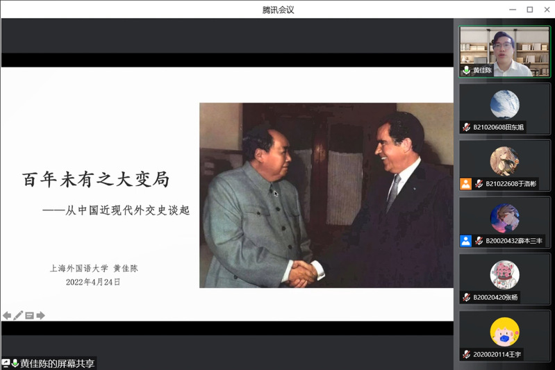 为普及国际关系与外交知识,在同学们心中牢固国家主权意识,培养全面发展的新时代人才,4月24日晚,新葡的京集团8814第118、119期菁英人才学校举行第四次授课。本次授课主题为“百年未有之大变局——从中国近现代外交史谈起”。根据疫情防控要求,本次授课以线上授课方式举行,由上海外国语大学国际事务与公共关系学院黄佳陈老师担任主讲人,新葡的京集团于洛彬同学担任主持。
