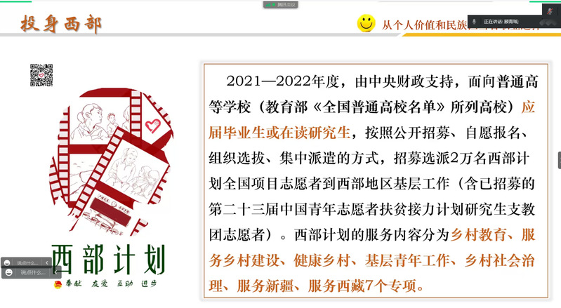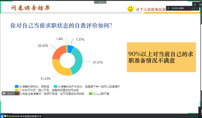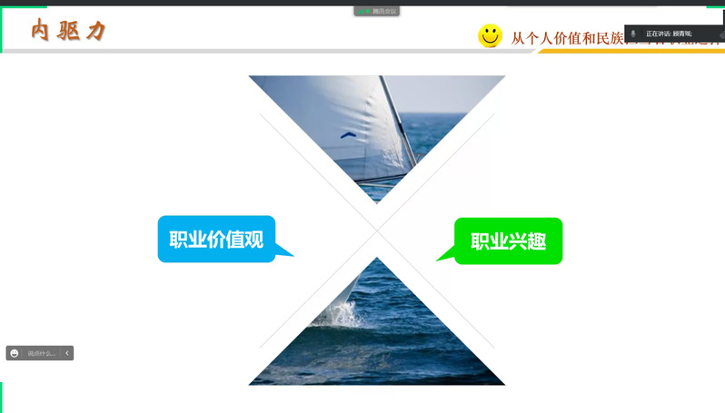讲座中,顾老师就“好工作”与同学们展开讨论,介绍今年的就业总体趋势和社会职业需求,如:西部计划、深入基层、心系国防、逐梦航天等。顾老师提出实现个人价值方向是要顺势而为。面对现如今90%的大学生对自己的求职准备情况不满意的现状,我们要探索自己的职业外显和深层价值观,结合时势,为自己的选择负责,并通过真实案例表明职业价值观的重要性。顾老师说“虽有智慧,不如乘势;虽有镃基,不如待时。”