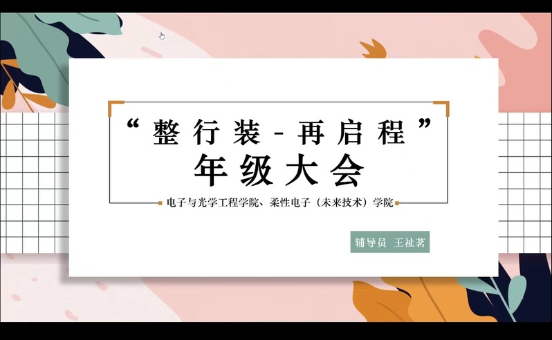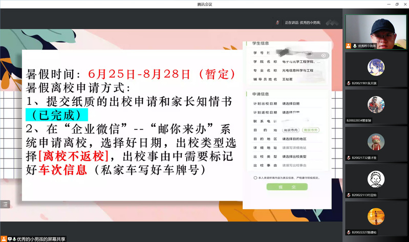 为引导同学们做好暑期离校报备工作,合理安排暑假生活,6月18日下午,新葡的京集团8814召开“整行装-再启程”年级大会暨辅导员面对面测评。本次年级大会由2020级辅导员王祉茗老师主持,光电信息科学与工程专业全体同学参加。