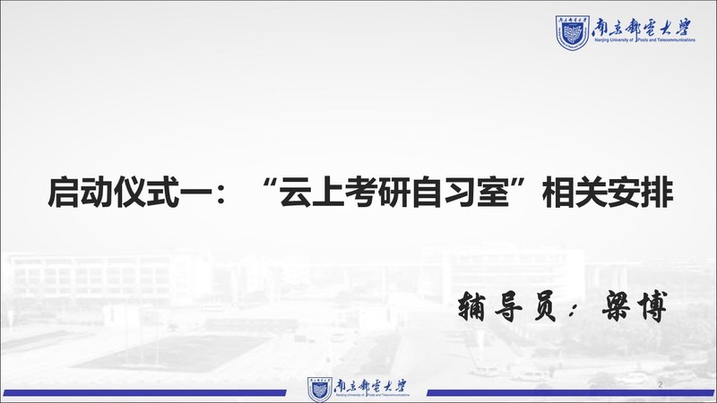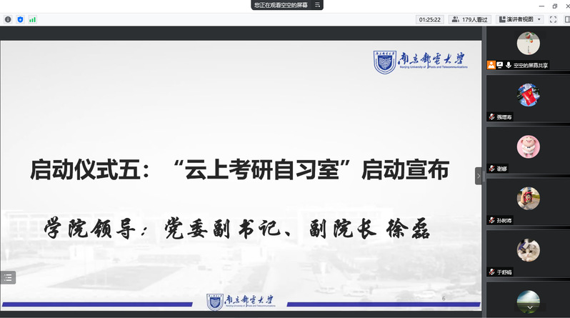 考研关键期在暑期,学习巩固期在暑期,发展奋斗期在暑假,为发扬自强好学的考研学风,增强学院学子的考研热情和信心,切实助力同学们的暑期考研,解决考研备考过程的困难与疑惑,7月4日,新葡的京集团8814举办线上“云上考研自习室”启动仪式。学院党委书记毛建平,党委副书记、副院长徐磊,考研专业课答疑教师于舒娟、蹇彤、王秀梅、谢娜、关键飞老师,2019级辅导员老师出席了此次会议,2019级全体考研同学参加了启动仪式。会议由祝腾老师主持。
