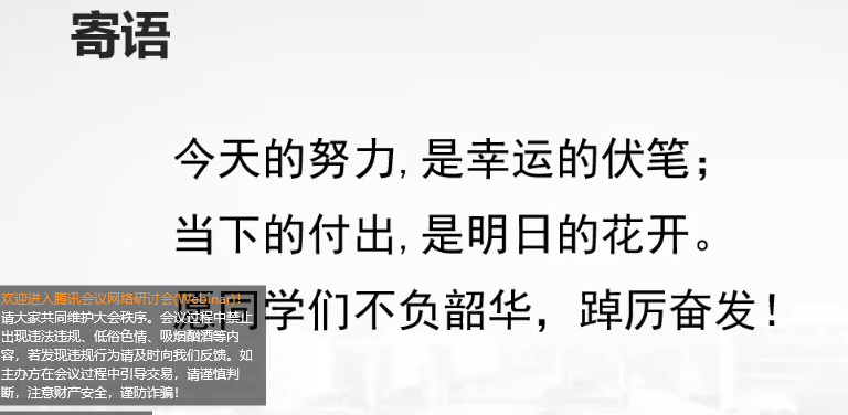 会议伊始,2019级辅导员梁博从五个方面全面解读了“云上考研自习室”的相关安排和要求,自习室以线上会议室为依托,以QQ答疑群为媒介实施开展。自75日起,每天8302230为自习时间。他提到,“云上考研自习室”的注意事项、打卡方式、进出自习室安排以及奖励机制。随后,教师代表于舒娟老师强调了选择考研的重要意义,介绍了专业课答疑计划、答疑方法、助研课程等安排,勉励同学们在暑期考研道路上砥砺奋进。