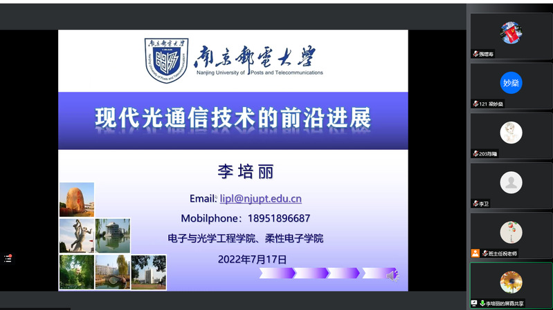 开营仪式结束之后,光学工程专业教师代表李培丽教授、电磁场与无线技术专业教师代表李波教授、电路与系统专业方向教师代表孙科学教授、物理电子学专业方向教师代表盛宇波教授和李炳祥教授、柔性电子专业方向教师代表李杨老师组成专家团为营员们连续开展了六场讲座,所有营员汇聚在电光柔院这座神圣的学术殿堂,深度学习了现代光通信技术前沿进展,畅游了令人神往的电磁世界,探索了人体生物信号的特性和穿戴式传感器,驰骋在竞争激烈的国际赛道——量子通信领域,走进了充满神奇的液晶之旅,了解了电子领域发展新机遇——柔性电子。