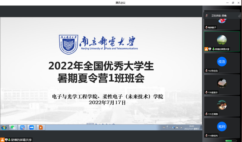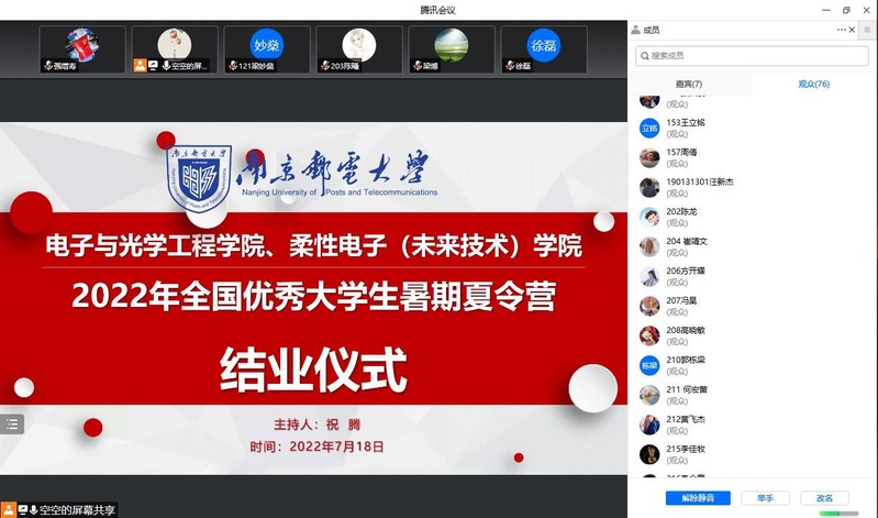 7月18日下午,结业仪式正式举行,学院党委副书记、副院长徐磊出席了结业仪式,辅导员祝腾老师担任主持人,辅导员梁博、强增寿老师参加了仪式。新葡的京集团8814梁妙燊同学和长春理工大学曾学成同学作为学员代表发言,分享了为期两天的夏令营感受。学院党委副书记、副院长为2022年全国大学生暑期夏令营致辞,她首先向参加夏令营的所有同学们致以亲切地问候和衷心地祝贺,感谢他们选择南邮电光柔院,欢迎同学们成为学院历史的参与者、见证者和缔造者,在这里学思践悟,知行合一。