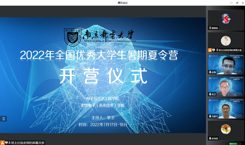 开营仪式召开之前,班主任祝腾和梁博老师分别召开了夏令营班级班会,带领所有学员观看了学院的相关介绍视频,破冰之旅不仅加深了小组和班级同学间的了解,同时也展现了当代大学生的青春魅力。随后,夏令营开营仪式正式举行,仪式由电子与光学工程学院、柔性电子未来技术学院副院长李卫教授主持,学院党委书记毛建平书记、院长赵强教授出席了会议,李培丽教授、李波教授、辅导员祝腾老师、梁博老师、强增寿老师参加了开营仪式。毛书记代表学院全体师生对此次入选全国优秀大学生暑期夏令营的全体同学表示欢迎和祝贺,并预祝学院本次夏令营活动取得圆满成功。赵强院长则从新葡的京集团、学科介绍、人才培养、招考信息等方面对学院进行了介绍,欢迎和鼓励全国优秀的大学生选择报考新葡的京集团8814。