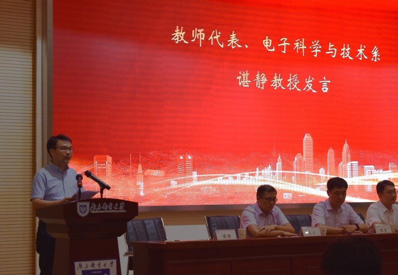 随后教师代表、电子科学与技术系谌静教授发言。谌教授希望同学们要志存高远,脚踏实地;要做一个博学而又术业专攻的人;要不忘初心,成为国之栋梁。并表示希望南邮的“红绿蓝”色彩为每一位同学的青春画卷绘上独一无二的底色,祝愿同学们在南邮愉快地学习和生活,不断地成长和进步,成为志存高远、德才兼备、勇于担当的时代精英!
