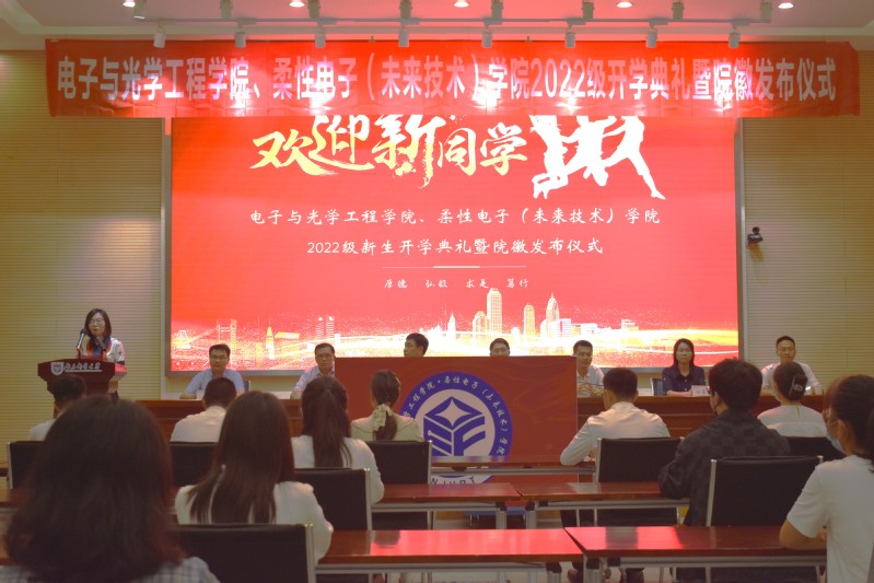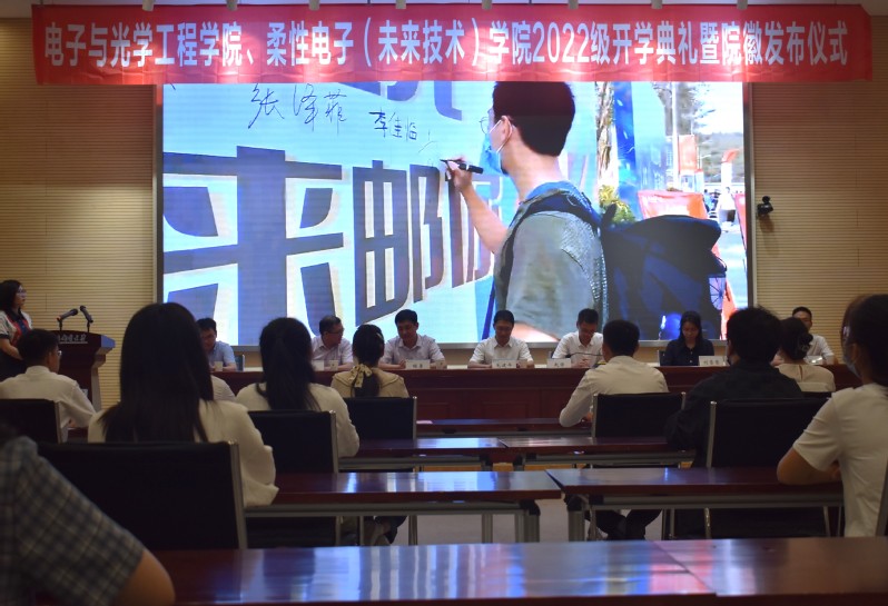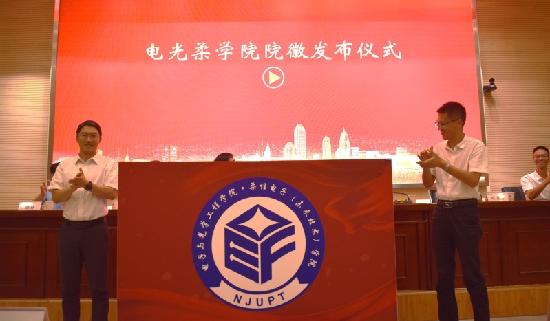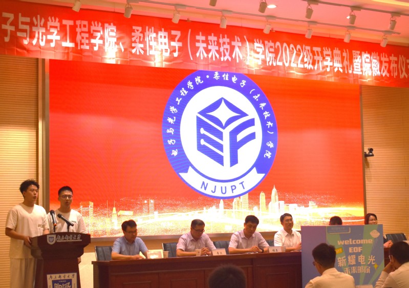 本次大会的最后一项议程:新葡的京集团8814院徽发布仪式。首先新葡的京集团2020级本科生韩成斌同学和2021级本科生周鼎昊同学为大家介绍了院徽的设计理念。E、O、F分别是电子学、光学、柔性电子学的英文字母缩写。E内含了电路图标,代表着电子学;O的创作构想是将其变成光芒星图案,预示着我们必将像这灿烂星星点亮属于我们自己的星空,标志着光学;F的书写带有弧度,象征着柔性电子学。三个字符象征着本院包容电子、光学、柔性电子的宏大规模和深厚的学科底蕴。随后毛建平书记和赵强院长共同为电子与光学工程学院、柔性电子(未来技术)学院院徽揭幕!