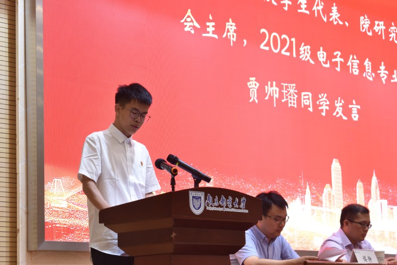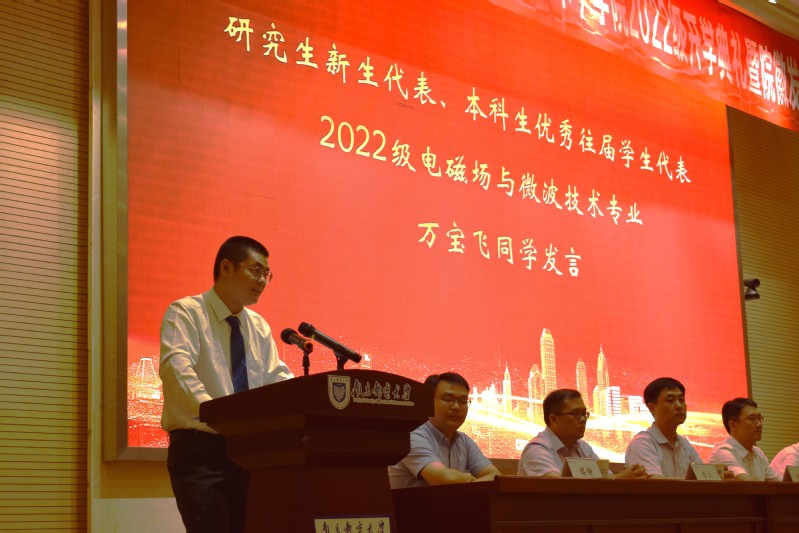 之后研究生高年级学生代表、院研究生会主席,2021级电子信息专业贾帅璠同学、研究生新生代表、本科生优秀往届学生代表,新葡的京集团2022级电磁场与微波技术专业万宝飞同学、本科生新生代表,2022级电子科学与技术专业创新班刘姮婧同学依次发言,用多彩的文字、不同的言语表达了对新生一致的诚挚祝福,抒发了对未来生活的憧憬期盼,鼓励了同学们树立开学新风貌。