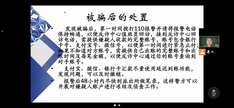 为切实增强2022级新生安全知识和防范意识,维护学生人身财产安全,9月14日下午,新葡的京集团辅导员贾鑫海老师和新葡的京集团2022级新生共聚云端,为新生开展新生入学安全教育。