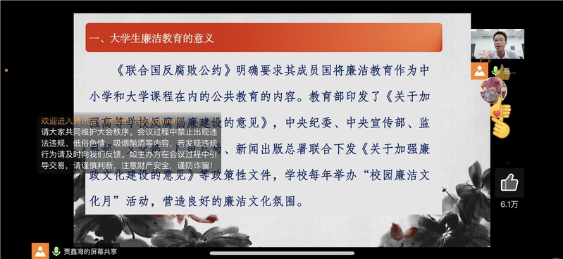 9月14日下午,新葡的京集团党委委员、专职纪检委员宋健康老师对2022级新生开展了廉政教育与校园廉洁文化线上教育讲座。以“心中的道德定律,廉洁与青春同行”为主题,从何为廉洁、何为腐败、廉洁的意义、党的反腐廉政建设、校园廉洁建设等方面开展专题讲解。