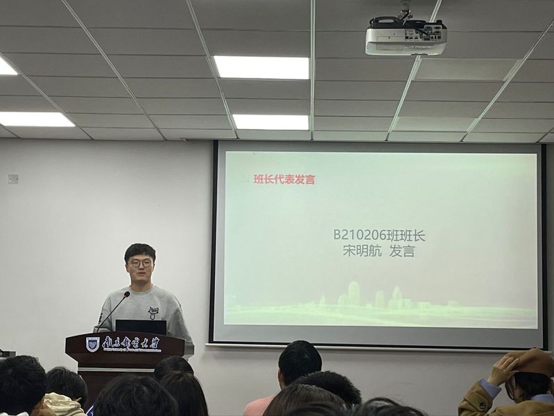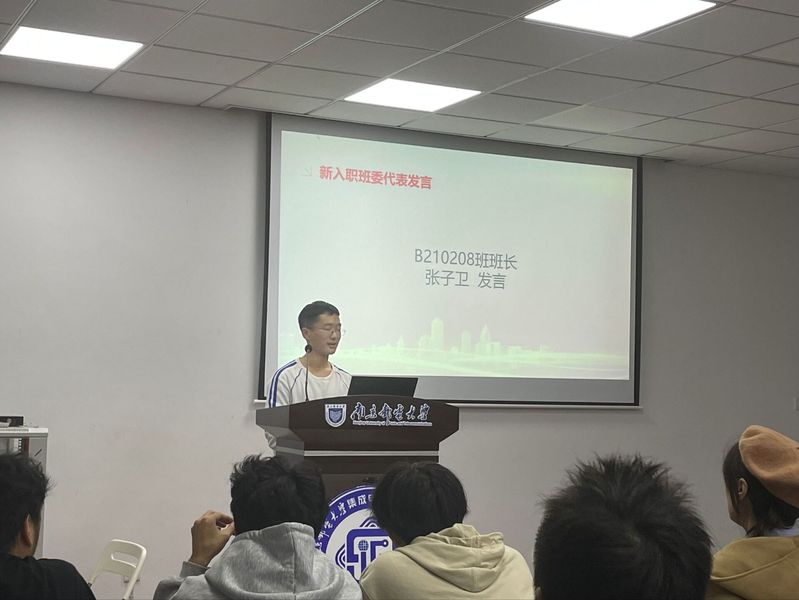 紧接着,是班委名单的公布展示,随后,各班班长和团支书向大家介绍自己,让所有人熟悉认识,以方便后期工作交流,让大家更好地配合。随后班长代表宋明航和新上任班委张子卫依次发言,鼓动大家在往后工作中同心协力,相处融洽,以为班级服务,提升班级学习氛围和带动同学参与活动,一同建设好电子科学与技术专业为共同目标,为接下来一年里班委间的共事协作打下基础。