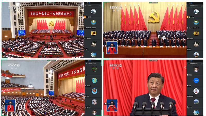 同志们早早提前进入观看学习状态。上午十点,大会准时开始,注目着习近平等领导同志步入会场,大家激动欣喜,盼望已久的盛会开始了。习近平总书记在报告中阐述了过去五年的工作和新时代十年的伟大变革。十九大以来,党中央统筹中华民族伟大复兴战略全局和世界百年未有之大变局,就党和国家事业发展作出重大战略部署,团结带领全党全军全国各族人民有效应对严峻复杂的国际形势和接踵而至的巨大风险挑战,以奋发有为的精神把新时代中国特色社会主义不断推向前进。十年来,党中央采取一系列战略性举措,推进一系列变革性实践,实现一系列突破性进展,取得一系列标志性成果,经受住了来自政治、经济、意识形态、自然界等方面的风险挑战考验,党和国家事业取得历史性成就、发生历史性变革,推动我国迈上全面建设社会主义现代化国家新征程。