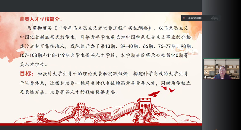 为深入学习贯彻党的二十大精神,引导青年学生成长为中国特色社会主义事业的合格建设者和可靠接班人。11月7日晚,由新葡的京集团8814承办的新葡的京集团8814第140期菁英人才学校开班仪式顺利举办。本次开班仪式在线上举行,院党委副书记、副院长徐磊及各年级辅导员老师出席会议,菁英人才班全体学员参与。会议由学院分团委书记肖俊桂老师主持。