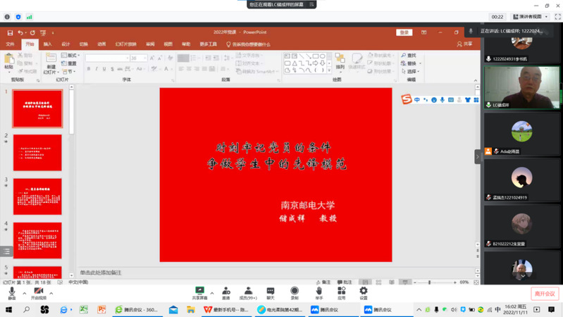 11月11日下午,校关工委副主任储成祥教授为学校党校第483期暨新葡的京集团8814第42期入党积极分子培训班授课,主题为“时刻牢记党员条件,争做学生中的先锋模范”,213名培训班学员线上参加。