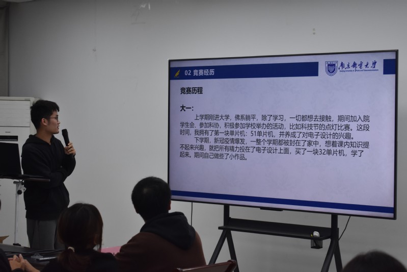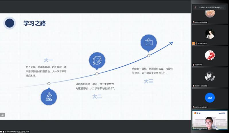 在25日的故事分享中,专业绩点第一,以一作发表多篇SCI论文的饶思思同学首先带来了自己的学习故事。她阐述了自己大学后从处于迷茫状态到找到学习目标方向的转变,用最终保研的结果向大家证明了及时找到适合自己的学习道路并为之努力的重要性。随后,曾任新葡的京集团科协主席,荣获多项竞赛奖项的代军同学就各类竞赛的最佳参赛时间、比赛重点向大家进行了讲解,指导大家根据自身优势选择适合自己的竞赛项目。获得过一等奖学金、三好学生、校长嘉奖令以及多项国家级奖项的唐承乾学长重点就电子设计类竞赛向大家详细介绍了竞赛特色以及涉及保研的竞赛成就要求,鼓励同学与志同道合的同学共同研讨、齐力奋斗。