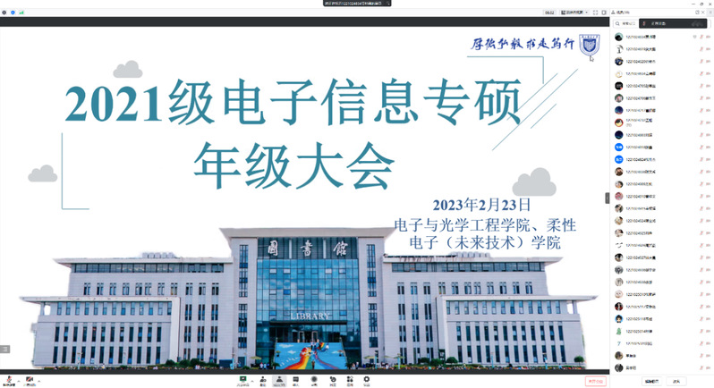 2月23日中午,新葡的京集团88142021级研究生电子信息专业召开线上年级大会,大会由辅导员郑景文老师主持,2021级电子信息专业全体研究生同学参加。