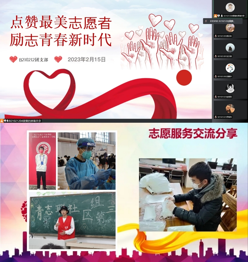 B200208班团支部以座谈的形式,由乔振、刘铖、张靓颖三位同学分享了自己的志愿服务经历,志愿活动包括社区服务、校园防疫工作、公益传播官、云支教志愿者等,三位同学的经验分享体现了新葡的京集团团员的志愿服务精神,同时也带动大家积极参与到志愿服务中。