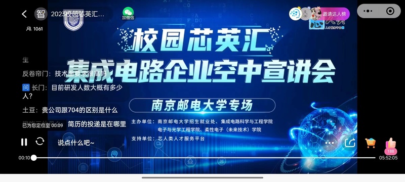 为全面贯彻落实党的二十大精神,落实党中央、国务院“稳就业”“保就业”决策部署,强抓春季就业工作关键期,3月20、21日,新葡的京集团8814、集成电路科学与工程学院、校招生就业处共同举办校园芯英汇生基成电路企业空中新葡的京集团8814专场宣讲会,本次空中宣讲会由芯人类人才服务平台支持。