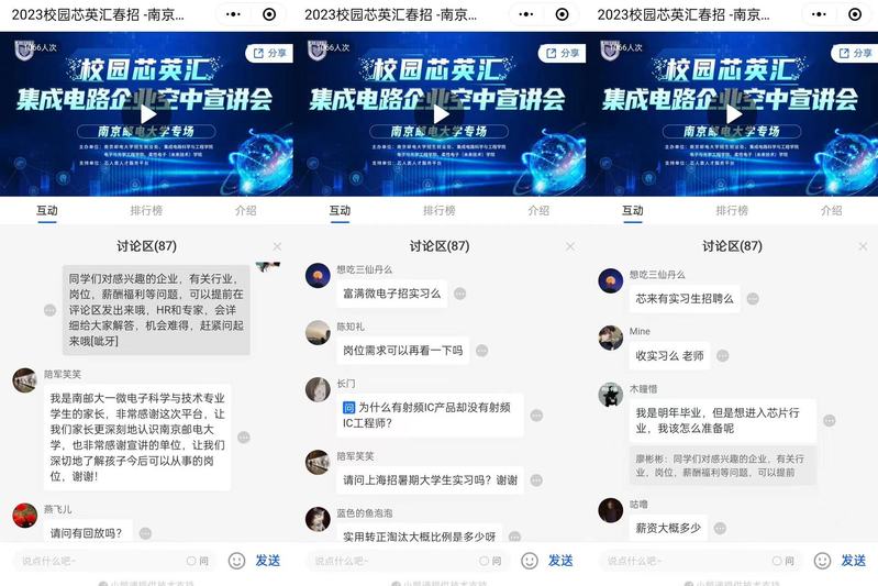 据悉,本次招聘宣讲会通过线上直播的形式,特别邀请电光柔学院副院长程勇和集成电路学院副院长蔡志匡全面介绍了两家学院的综合实力和育人优势,并由芯人类人才服务平台主持推荐了中国电子科技集团公司第四十七研究所、北京国科天迅科技股份有限公司、深圳市纽瑞芯科技有限公司等17家集成电路领域的企业招聘信息,提供近百个就业岗位。