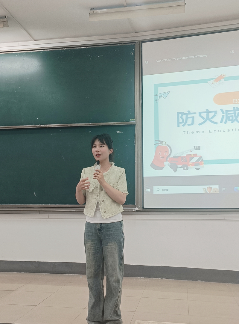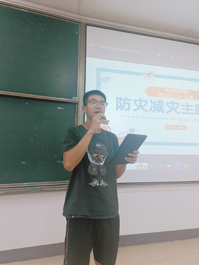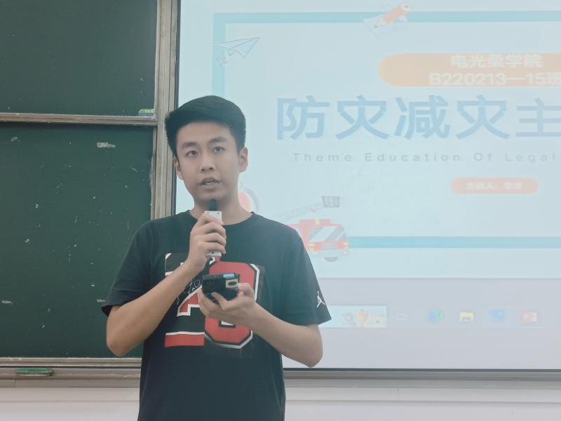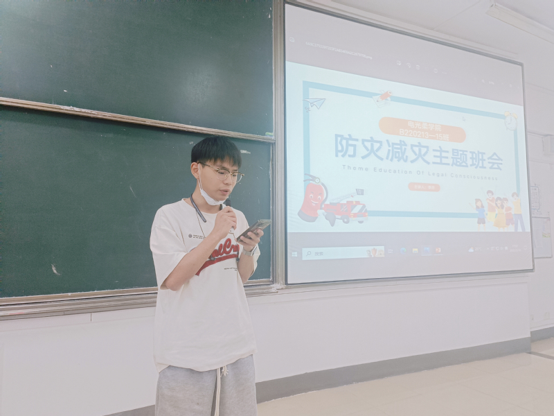 B220213班学习委员赵羿豪同学通过普法教育、防灾常识、急救常识三个板块向同学们科普了防灾减灾的相关知识,普法教育使同学们了解我国各项防灾减灾的法律法规及常见的防灾减灾条例,感受到自己作为公民的义务与责任,体会到防灾减灾工作的重要性和意义。接着,主持人向同学们普及了防灾常识。通过介绍遇到地震、火灾、洪水等险情的应对方法,同学们对防灾减灾的内涵有了更为深刻的理解。最后,主持人就生活中的急救常识展开介绍,使同学们了解了生活中各种突发情况和意外的应对措施。