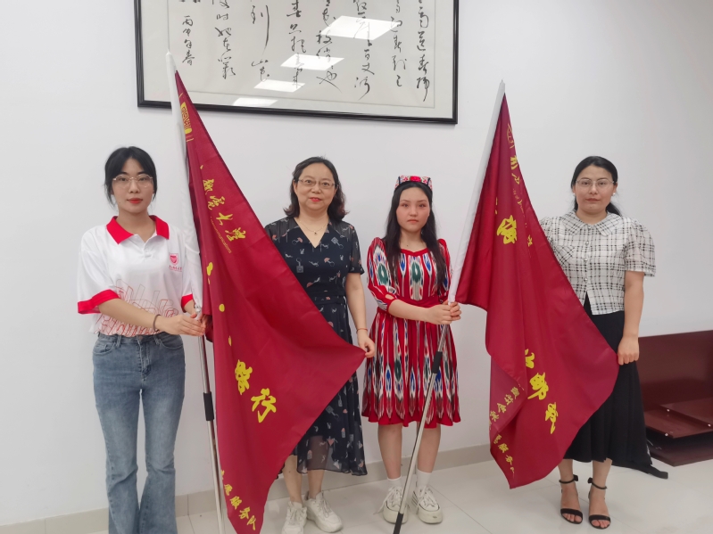 授旗仪式上,徐磊书记、肖俊桂老师、祝腾老师和古丽老师共同为社会实践团队代表及赴新疆、青海少数民族地区推普助力乡村振兴实践团授予队旗。随后,在主持人雷蕾同学的带领下,全场进行了宣誓仪式,一个个高举的拳头,一声声慷慨有力的誓言,展现出电光青年学子的昂扬斗志。
