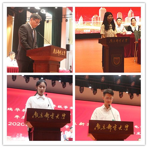 研究生高年级学生代表、院研究生会主席郭龙飞同学和本科生高年级学生代表,瑞华奖学金获得者、新葡的京集团8814年度人物、校国旗护卫队队长屈新月同学分别代表研、本老生对新同学的到来表示欢迎,并祝福新同学们在青春的赛道上跑出傲人成绩!研究生新生代表黄瑞玉同学和本科生新生代表马兴宇同学也在发言中表示,在往后的求学岁月里,将始终铭记刚踏入校园时的那份初心,努力成为“厚德、弘毅、求是、笃行”的南邮人。