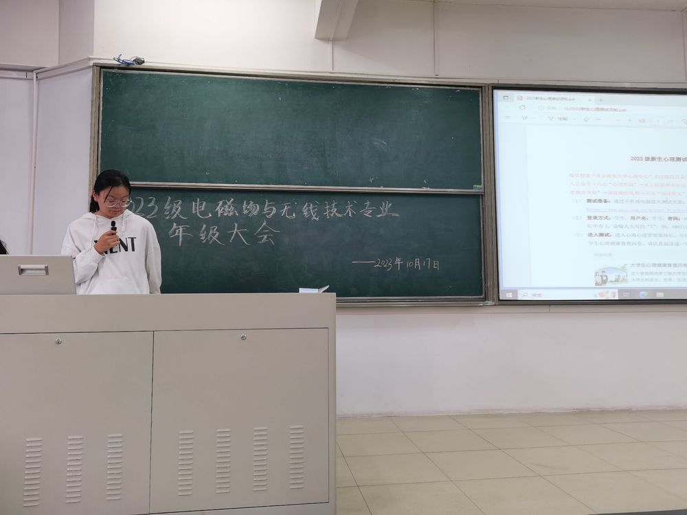 大会伊始,古丽老师重点围绕日常工作、学风建设和支部建设等方面展开。在安全教育环节,古丽老师分别从违章电器、网络安全、人身安全等方面提醒大家,并着重强调了宿舍安全,请大家遵守学校管理规定,注意自我防护。随后,她具体分析了电磁场与无线技术专业前景,提醒同学们端正态度,树立专业自信,认真对待学习,积极迎接挑战,并做好学业规划。古丽老师还希望大家在努力学习的同时关注身心健康,学会自我管理与自我约束,新的征程,不留遗憾。希君生羽翼,一化北溟鱼,古丽老师呼吁同学们在大一就树立好目标,踔厉奋发,笃行不息。最后,在胡丹妮同学的帮助下,全体同学积极完成心理测试。