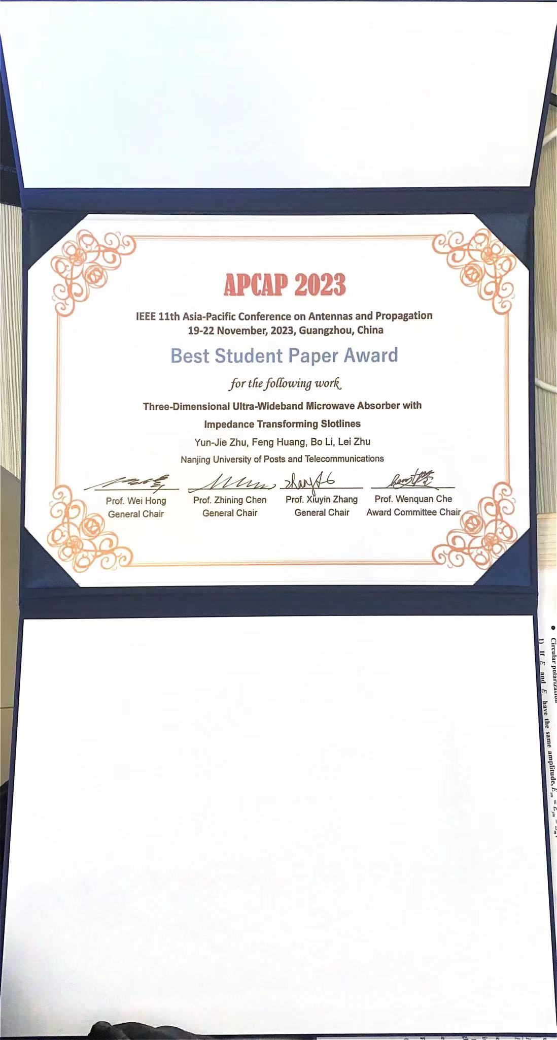 新葡的京集团的博士一年级研究生朱云杰(指导老师:祝雷教授、李波教授、黄烽副教授)的论文《Three-Dimensional Ultra-Wideband Microwave Absorber with Impedance Transforming Slotlines》在竞争激烈的最佳学生论文竞赛中脱颖而出,成功荣获会议最佳学生论文奖。