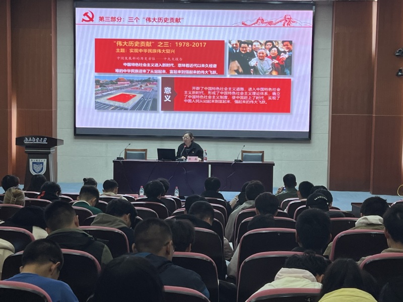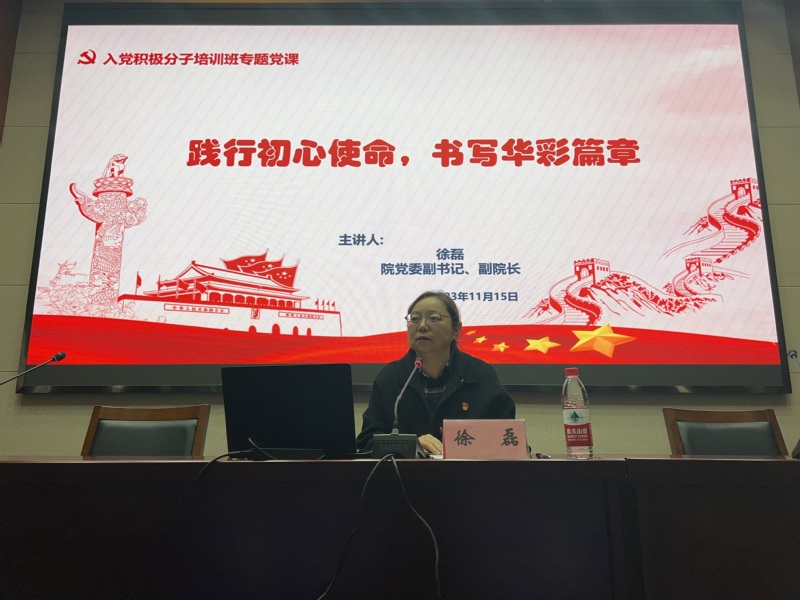 开班仪式结束后,由徐磊书记为全体同学带来授课,主题是“践行初心使命,书写华彩篇章”。徐书记首先向同学们介绍了中国共产党人的初心和使命,强调同学们要做到“不忘初心,方得始终”,并通过引用《共产党宣言》《党章》内容,解读红色歌曲,阐释红船精神。她以新时代如何践行青年学子的初心和使命为题,通过对“三个明确”的介绍,围绕“初心”和“使命”展开解释,徐书记呼吁号召同学们将爱党、爱国和爱校融入青春成长,努力争做优秀学子,为成长不断增添绚丽色彩。
