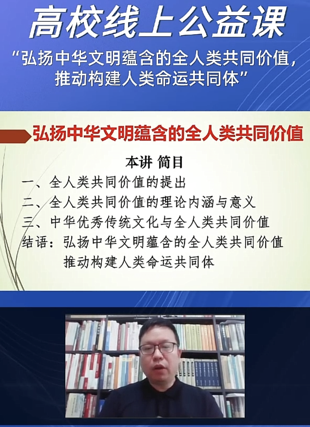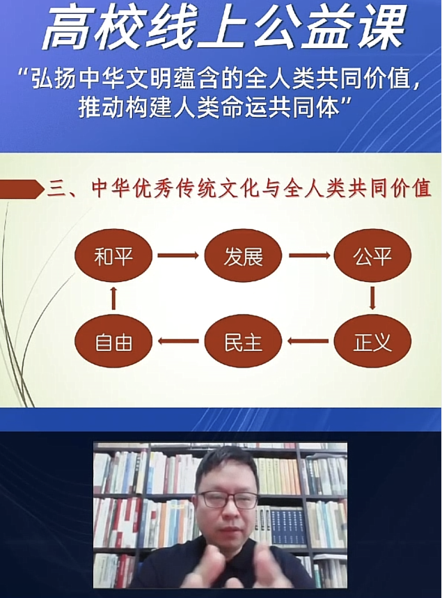 为帮助同学们学习了解人类命运共同体的时代意义及深刻内涵,领悟认同中华文化对全人类的共同价值。近日,新葡的京集团8814第169期菁英人才班第二次授课通过高校线上公益课的方式举行,课程主题为——弘扬中华文明中蕴含的全人类共同价值,推动构建人类命运共同体,由中央社会主义学院中华文化教研部副主任翁贺凯教授主讲。