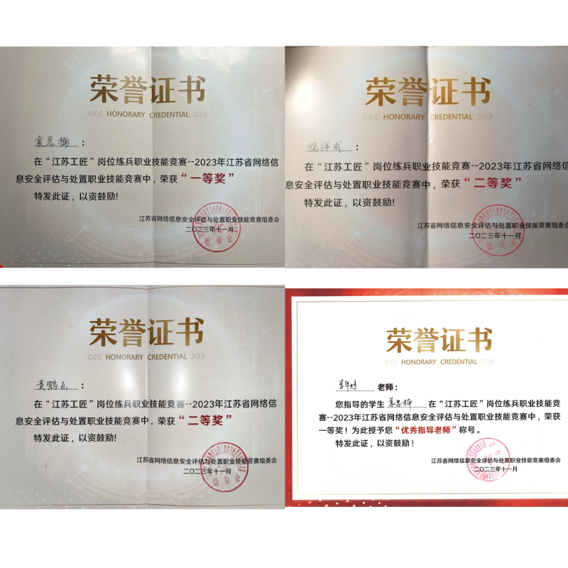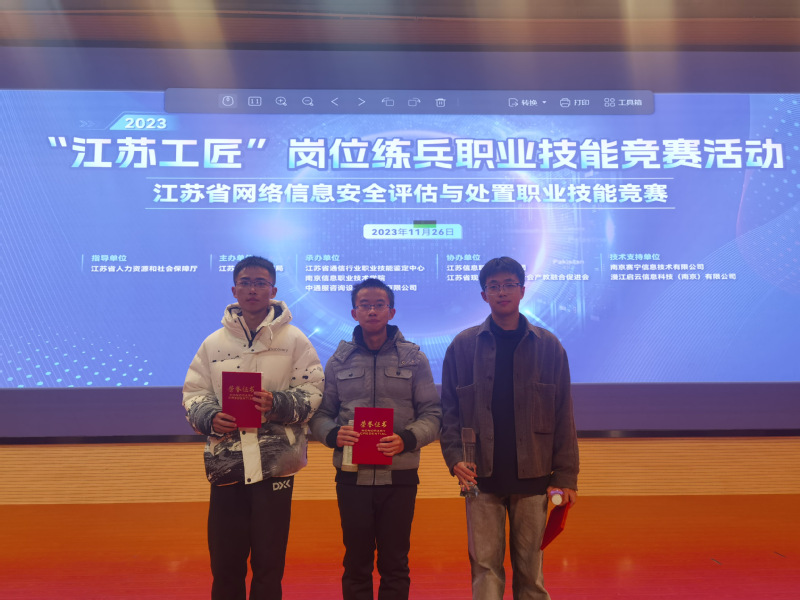 本次竞赛为省级一类竞赛,赛项共分为初赛和决赛两个阶段、职工组和学生组两个赛道,全省共计1200多名选手参加初赛,210名选手参加决赛,决赛于11月26日在南京信息职业技术学院举行。新葡的京集团三名学生鏖战4个小时,经过综合理论考核、CTF解题考核、安全分析与运维考核、综合分析与报告考核等四个模块的比赛,最终获得了综合成绩学生组一等奖一名(袁思楠)、二等奖两名(徐泽成、黄鹤东)的好成绩;李华婷老师被授予“优秀指导教师”称号。在备赛期间,参赛团队合理安排训练计划,线上线下开展技术交流、战略战术讨论,突破疑难问题,坚持不懈,发扬了“不服输、敢争先”的精神。