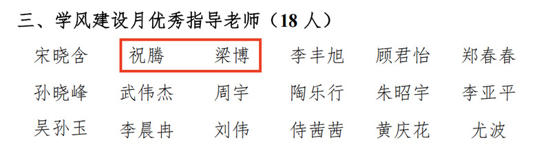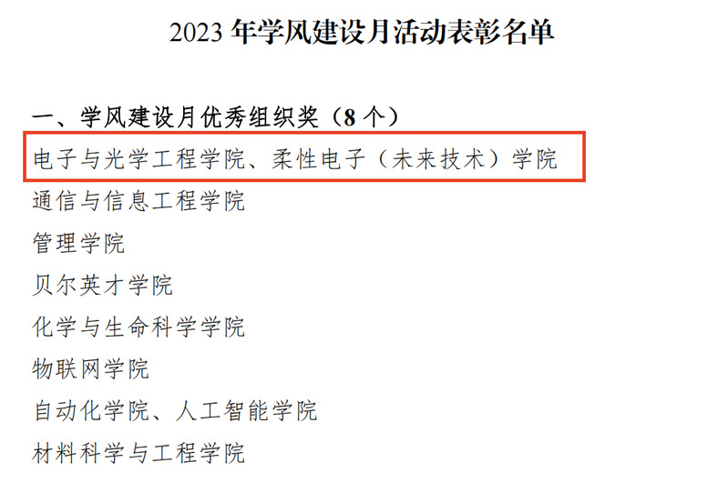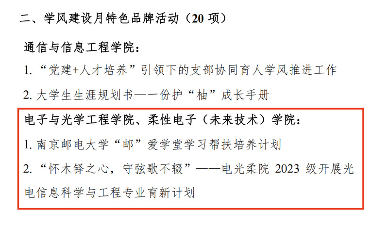 经学院积极组织申报,学生工作部审核差额评审,新葡的京集团荣获“学风建设月优秀组织奖”;“新葡的京集团8814‘邮’爱学堂学习帮扶培养计划”、“‘怀木铎之心,守弦歌不辍’——电光柔院2023级开展光电信息科学与工程专业育新计划”两项活动荣获“学风建设月特色品牌活动奖”;祝腾、梁博两位辅导员老师荣获“学风建设月优秀指导教师”称号;10个班级荣获“学风建设月先进班级”称号;123位同学荣获“学风建设月先进个人”称号。