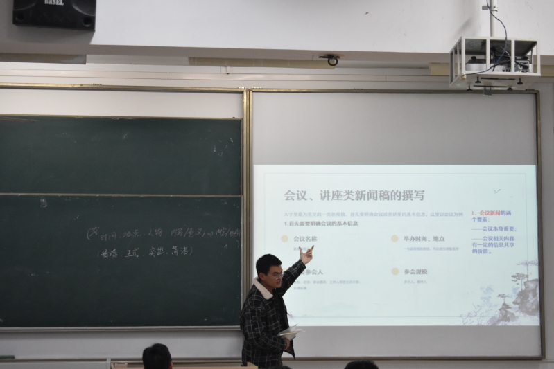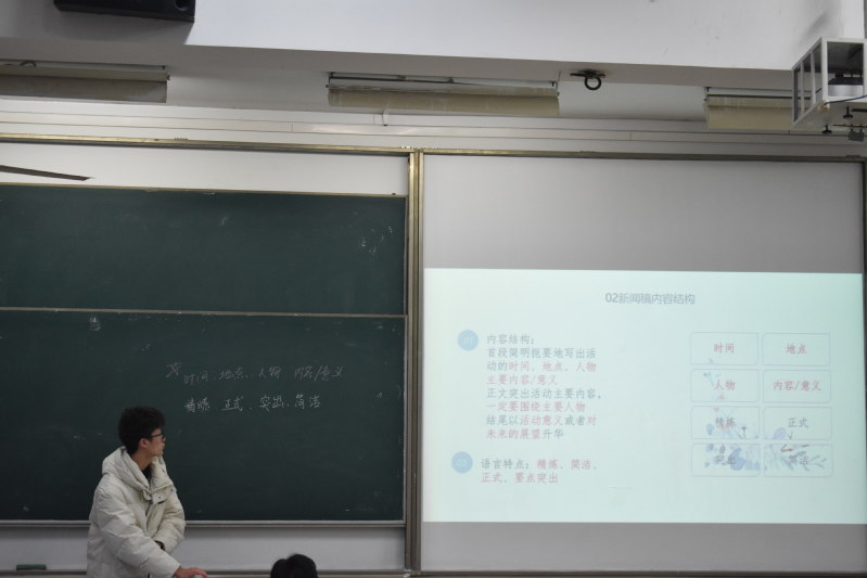 分团委宣传部部长孔子澳同学也分享了他的见解。他详细介绍了新闻稿的基本定义与作用,并深入分析了会议类与讲座类新闻稿的写作特点。他指出,大部分新闻稿是按照倒金字塔的结构展开,按照时间或逻辑的顺序叙述。同时,他特别说明了会议类新闻稿主体内容的重要性,讲解了提炼讲话内容要点的方式方法。