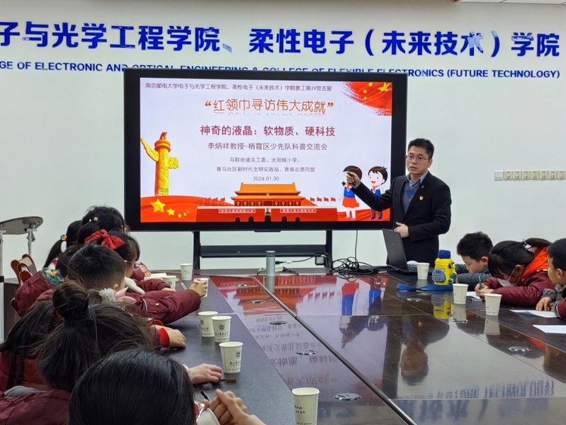 参观完实验室后,李炳祥与少先队员们开展了题为“神奇的液晶:软物质、硬科技”的科普交流会。交流会上,同学们观看了新葡的京集团881480周年校庆主题宣传纪录片,了解了新葡的京集团的红色历史、发展历程和瞩目成就。接着,李炳祥向同学们科普了液晶在显示与非显示领域中的科研应用,并鼓励同学们投身科研,探索液晶科学的星辰大海。李炳祥引用习近平总书记给南京大学留学归国青年学者回信中的话语勉励同学们:“以报效国家、服务人民为自觉追求,在坚持立德树人、推动科技自立自强上再创佳绩,在坚定文化自信、讲好中国故事上争做表率,为全面建设社会主义现代化国家、实现中华民族伟大复兴的中国梦积极贡献智慧和力量!”