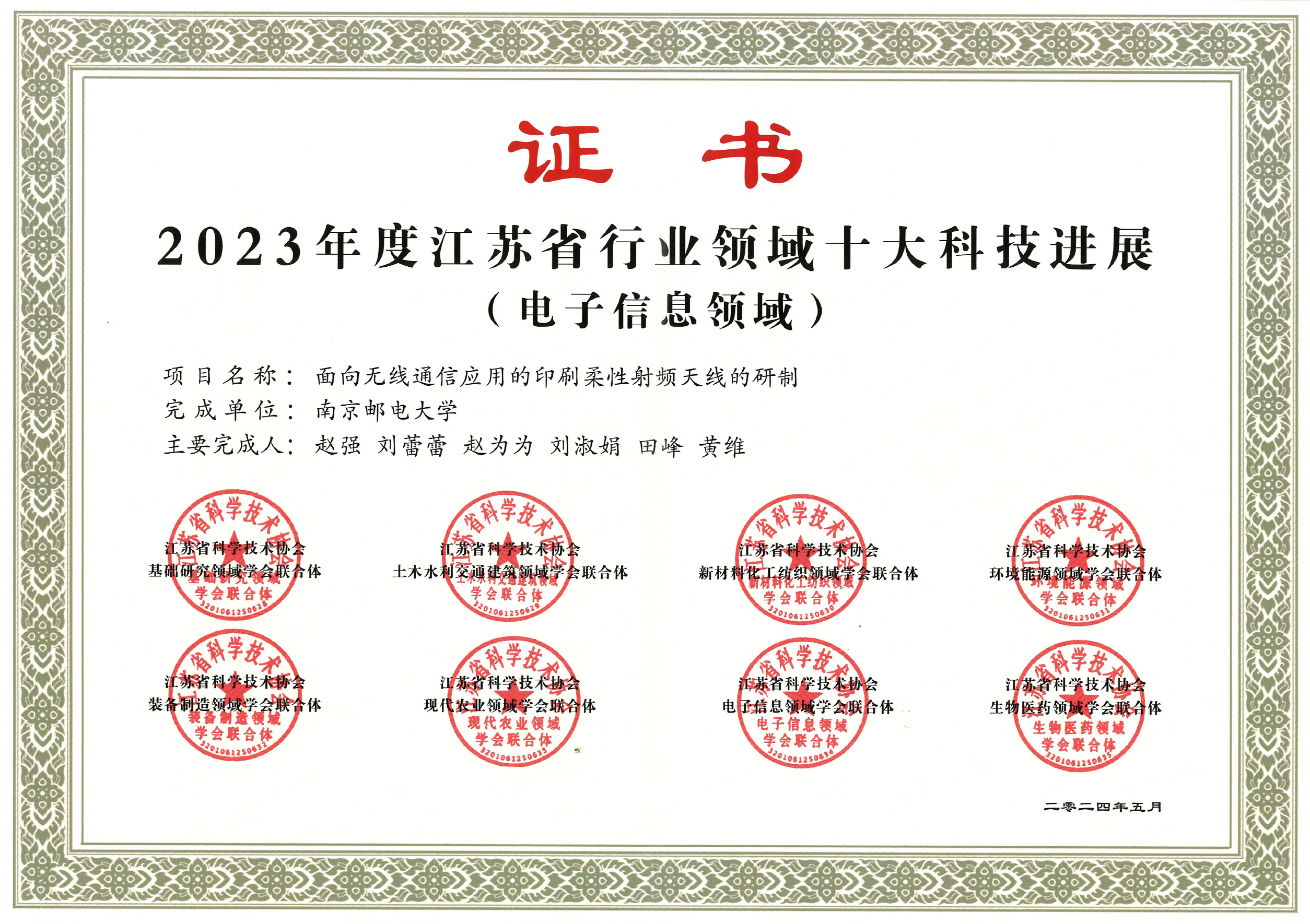 在第八个全国科技工作者日来临之际,由江苏省科学技术协会、江苏省科学技术厅主办的2024年全国科技工作者日江苏省主场活动在南京举行。会上,发布了2023年度江苏省行业领域十大科技进展。新葡的京集团8814有机电子与信息显示国家重点实验室黄维院士、赵强教授团队联合射频集成与微组装技术国家地方联合工程实验室刘蕾蕾教授团队、宽带无线通信与传感网技术教育部重点实验室田峰教授团队完成的“面向无线通信应用的印刷柔性射频天线的研制”成果入选“电子信息领域”十大科技进展。