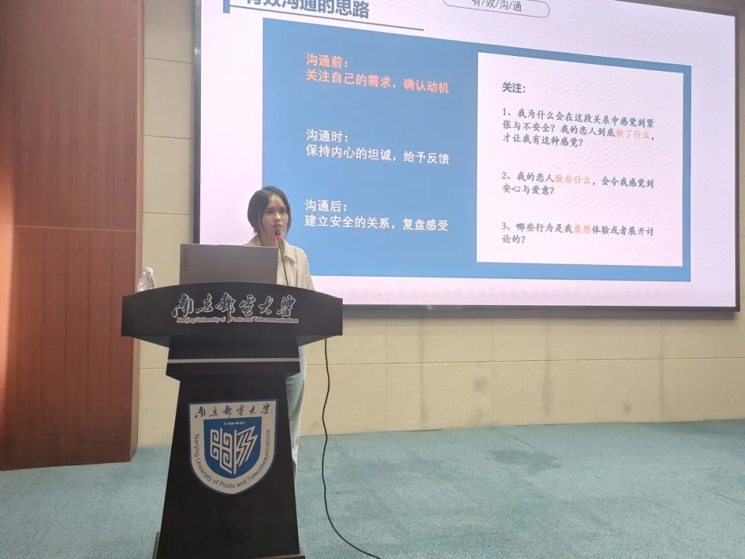 顾中婷老师以她身边朋友的经历为切入点,向同学们讲述了在恋爱中学会沟通的重要性,并引出了今天的主题:如何通过有效沟通创造一个美好的恋情。