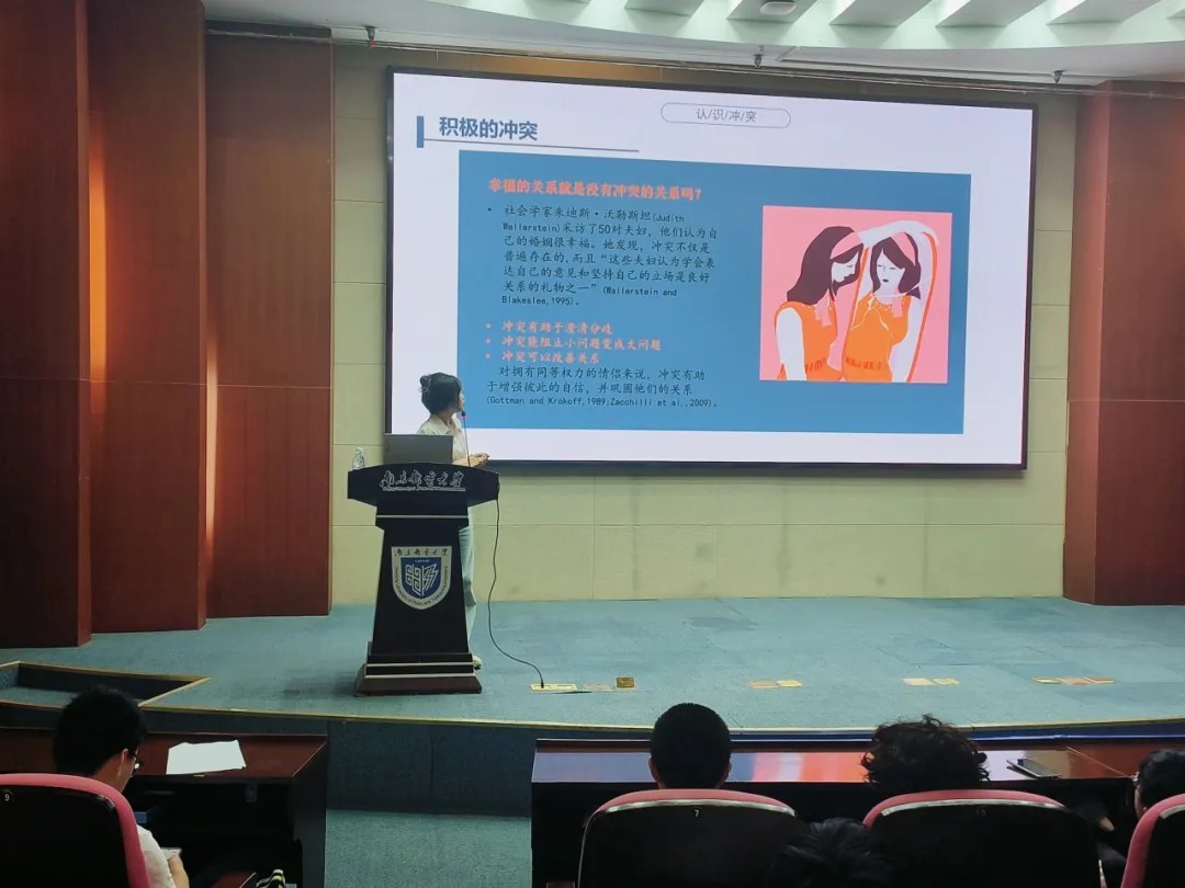 冲突在亲密关系中不可避免,为了让同学们了解有效沟通在恋爱中的作用,学会处理冲突,近日,新葡的京集团与贝尔英才学院合办心理健康讲座,邀请国家三级心理咨询师顾中婷老师为同学们带来主题为“有效沟通:美好恋情的秘密”的讲座。