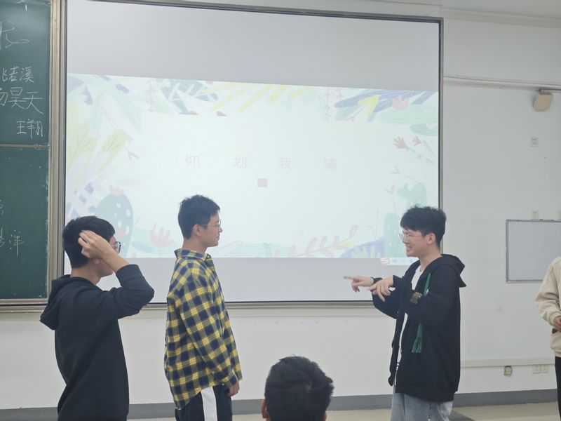 接下来,会议进入“你划我猜”破冰环节。同学们站成一排,每个人的脸上都洋溢着期待与兴奋的笑容。游戏的规则很简单,一人比划动作并传递给下一人,由最后一个人将所猜测的词语表达出来。参与者们各显神通,有的通过夸张的肢体动作让人捧腹大笑,有的则通过巧妙的暗示让人恍然大悟。每一次成功猜出答案,都会引来一阵阵欢呼和掌声。本来陌生的面孔逐渐熟悉,整个教室充满了欢乐与和谐的气氛,同学们也在欢声笑语中加深了对彼此的认识。