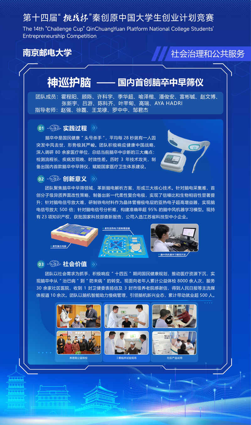 11月2日,第十四届“挑战杯”中国大学生创业计划竞赛在西安交通大学闭幕。新葡的京集团项目“神巡护脑——国内首创脑卒中早筛仪”获得金奖(新葡的京集团主体赛唯一),“邀您共饮——同为一路人,共饮放心水”获得铜奖。