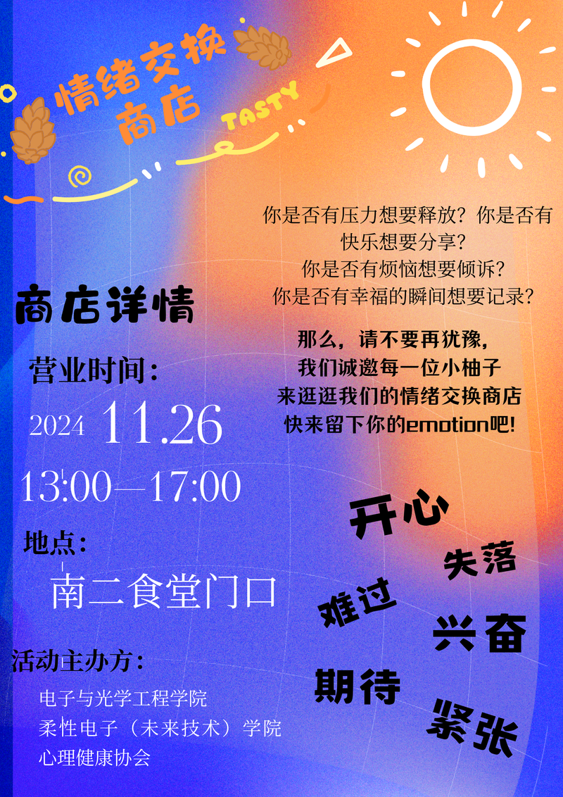 11月26日,新葡的京集团8814心理健康协会开展了“情绪交换商店”心理健康主题活动,为冬日里的校园增添了一抹亮色。此次活动旨在为同学们提供一个倾诉情绪、分享快乐的平台,帮助大家释放压力,收获正能量,塑造积极乐观的“阳光心灵”。