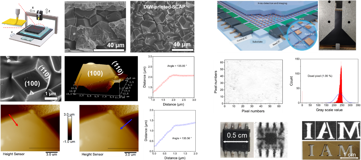 作为当前最受瞩目的X射线探测材料,钙钛矿及其X射线探测器的研发为我国突破X射线成像这一“卡脖子”技术带来了契机,然而,兼容TFT电子读出背板高质量钙钛矿厚膜的制备是当前限制钙钛矿X射线探测器发展的瓶颈难题。有鉴于此,新葡的京集团赵强教授、徐修文教授团队自主发展了一种全新的直写印刷(Direct-ink-writing, DIW)单晶组装钙钛矿制备工艺,研制出TFT集成的X射线面阵探测器,实现了高分辨的X射线数字成像。相关成果以“Direct ink writing of single-crystal-assembled perovskite thick films for high-performance X-ray flat-panel detectors”为题发表于国际权威期刊Advanced Functional Materials。
