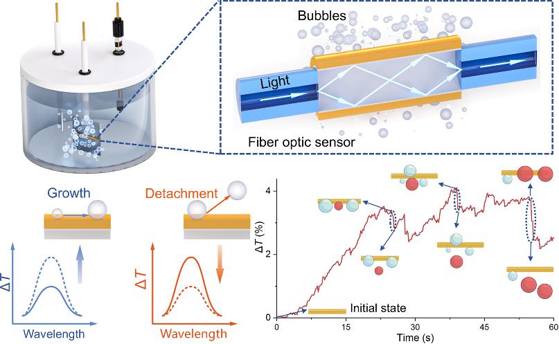 针对这一难题,研究团队首先系统梳理了从电极表面到电解槽内部的多种气泡监测技术。论文指出,电极表面方法虽然能够获得高空间分辨率,但难以兼顾时间分辨率,且图像数据处理繁琐;而利用 X射线或中子成像等方法探测电解槽内部气液两相流,则因成本高昂和操作复杂而难以普及。文章明确提出,发展具备高灵敏度、耐极端环境、可嵌入使用的光纤传感技术,有望打破现有瓶颈,推动气泡研究向工程化应用转变。成果以综述形式发表于《科学通报》。